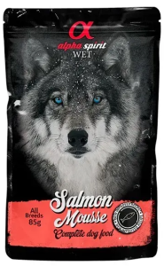Alpha Spirit Salmon Mousse – нежный влажный корм из 95% лосося для собак всех пород. Муссовая текстура легко усваивается, поддерживает здоровое пищеварение и блеск шерсти, а также даже для собак с чувствительными зубами и деснами. Идеально подходит как основной рацион или дополнение к сухому корму.