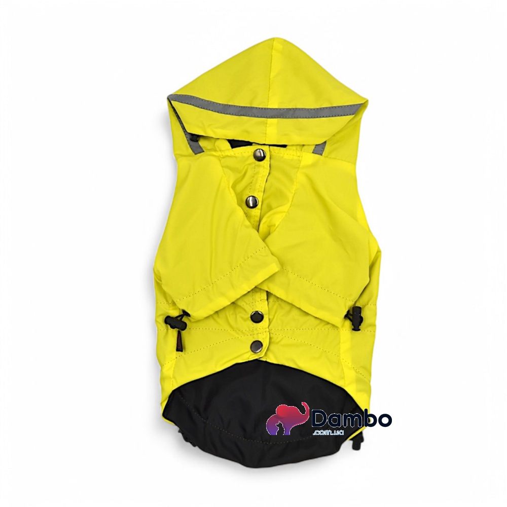 Стильный желтый дождевик Pet&Co защищает собаку от влаги и грязи, удобные кнопки на животике, регулировочные резинки, рефлективную ленту на капюшоне и разъем для шлейки. Легкий, практичный и идеален для прогулок в любую погоду.