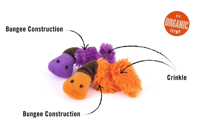 Это тот самый сет «червячков», который выбивает кошек из режима сон-еда-сон и включает режим «хищник на охоте». Яркие, легкие и очень привлекательные для кошек, они созданы специально для прыжков, беготни и отработки настоящих охотничьих движений. Каждая игрушка имеет упругий «хвостик», хаотично двигающийся при малейшем прикосновении и пробуждающий интерес даже у ленивых котиков. Внутри — хрустящие элементы, придающие эффекту добычи и удерживающие внимание дольше обычного. Плюс — в начинке использована сертифицированная органическая мята Mountain Rose Herbs, которая работает мягче, но стабильнее, чем обычные дешевые аналоги. Мурчик кайфует, а ты наблюдаешь за этим как за лучшим сериалом. Для прочности производитель использовал двойной слой ткани и двойные строки прошить — чтобы кошачьи зубы и когти не завершили игру за 5 минут. Наполнитель – экологичный PlanetFill® из 100% переработанного пластика, безопасный для животных и планеты.