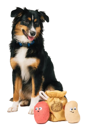 Интерактивный 3-в-1 набор для собак: две мягкие картофелины с пищалками и хрустящий мешочек. Ручная работа с двойными швами, экологичный PlanetFill®, безопасные красители AZO-free. Развивает активность, мышление и обеспечивает часы веселья.