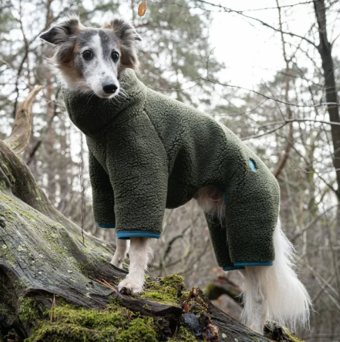 Cloud7 Cornwall Greyhound — теплый флисовый свитер в стиле тедди, созданный специально для борзых, уипетов и других пород с узким, вытянутым телом. Оливковый комбинезон с полным покрытием лап плотно окутывает собаку мягким теплом, не ущемляя движений и не собираясь в складки благодаря особому крою. Модель обеспечивает максимальное утепление – спина, живот, почки, лапы – все в тепле даже в прохладные и зимние дни. Комфортная, эластичная бирюзовая окантовка не только придает контрастный акцент, но и помогает свитеру плотно и аккуратно сидеть на теле борзой. Cornwall легко одевается, не мешает здоровому движению борзых, любящих скорость и свободу. Отверстие в зоне шеи позволяет крепить поводок непосредственно к ошейнику, а посадка учитывает анатомические особенности: глубокую грудную клетку, узкую талию и длинные ноги. Идеальный вариант как для холодных вечерних прогулок, так и для повседневного зимнего использования.