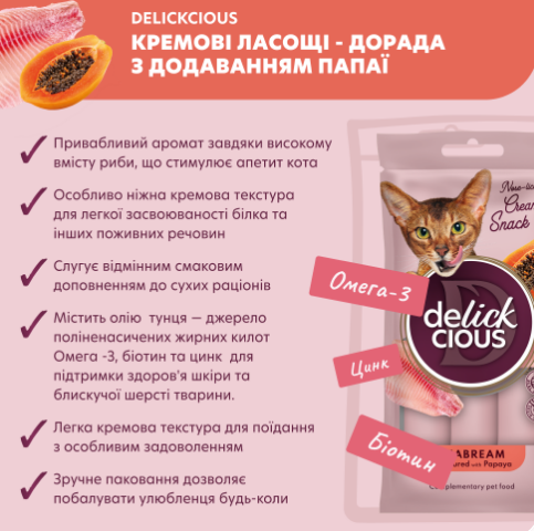 Смачне рішення, щоб урізноманітнювати раціон кота. Делікатний смак морської риби у поєднанні з корисною екзотикою на легкій кремовій основі. Зручно почастувати улюбленця для заохочення у вправах, іграх чи просто щоби побалувати тут і зараз. Шовковиста текстура ласощів дарує насолоду, а натуральні інгредієнти і збалансований склад допомагають підтримувати котяче здоров’я на 9 життів наперед.