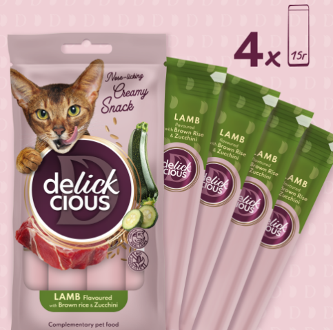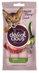 Новинка для справжніх гурманів: мікс апетитної ягнятини з ніжним цукіні та легкозасвоюваним коричневим рисом у кремових ласощах для котів.