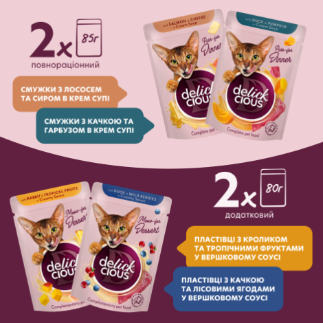 DELICKCIOUS™ "ПЛАСТІВЦІ З КАЧКОЮ ТА ЛІСОВИМИ ЯГОДАМИ У ВЕРШКОВОМУ СОУСІ". ДОДАТКОВИЙ КОНСЕРВОВАНИЙ КОРМ ДЛЯ ДОРОСЛИХ КОТІВ.