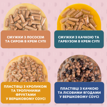 DELICKCIOUS™ "СМУЖКИ З ЛОСОСЕМ ТА СИРОМ В КРЕМ СУПІ". ПОВНОРАЦІОННИЙ КОНСЕРВОВАНИЙ КОРМ ДЛЯ ДОРОСЛИХ КОТІВ.