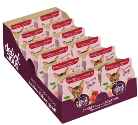 Коли їжа вже закінчилася, але кіт продовжує облизувати мисочку — це про наші супи. Апетитна курка зі стиглими томатами і зеленим шпинатом поєднані за спеціально розробленим рецептом для щоденного годування з нескінченною насолодою. Збережений смак, відбірні складники, баланс поживних речовин і різноманіття текстур дарують вашому коту задоволення від життя.