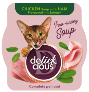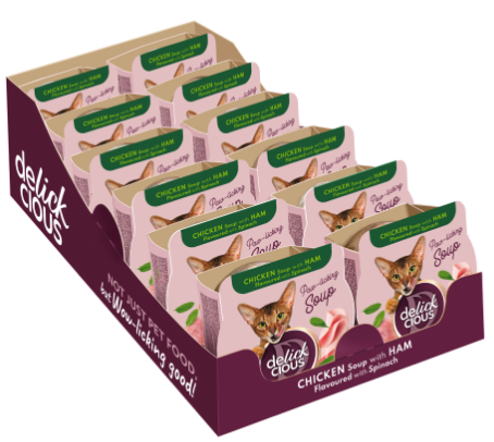 Ароматний повнораціонний корм з ретельно відібраних інгредієнтів. Ніжна шинка, шматочки курки та шпинат — цей суп тішить кота буянням смаків і різноманіттям текстур. Підходить для щоденного годування. Рецепт розроблений таким чином, аби улюбленець отримував справжню насолоду від їжі, а ви мали радість кожного дня спостерігати за щасливою твариною.