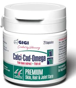 Вітамінно-мінеральний комплекс для підтримки шкіри, шерсті та опорно-рухового апарату собак і котів. GiGi Calci-Cod-Omega — це збалансована добавка, створена для комплексної підтримки здоров’я шкіри, шерсті, суглобів і кісток домашніх тварин. Завдяки поєднанню риб’ячого жиру Dry n-3® та мінерального комплексу Phoscalim®, засіб забезпечує організм необхідними жирними кислотами Омега-3, кальцієм і фосфором, що сприяють регенерації тканин та зміцненню скелета. Препарат незамінний у період відновлення після травм або операцій, при сухій чи подразненій шкірі, випадінні шерсті, а також як профілактика остеопорозу у тварин.
