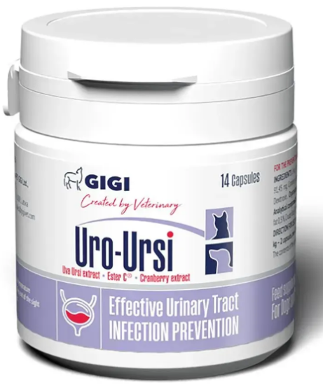 GiGi Uro-Ursi — це натуральний вітамінно-мінеральний комплекс, розроблений для профілактики та підтримувальної терапії при захворюваннях сечовивідних шляхів у котів і собак. Завдяки природним компонентам засіб має легку діуретичну, антисептичну та протизапальну дію, допомагає виводити з організму надлишок рідини, кристали солей і токсини, нормалізує pH сечі та сприяє здоровій роботі нирок. Uro-Ursi можна застосовувати як самостійно, так і у складі комплексної терапії — він підсилює дію антибактеріальних препаратів і прискорює відновлення після циститу чи інших інфекцій сечових шляхів.