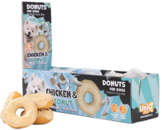 Смачні жувальні ласощі UNIQ PETS з куркою, кокосом і колагеном — це білкова насолода та користь в одному пончику! Підтримують м’язи, суглоби й блиск шерсті, а форма кільця очищає зуби під час жування. Ідеально для дресирування або просто як щоденна винагорода.