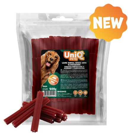 Подаруйте своєму цуценяті здоров’я зубів і суглобів одночасно з зубними паличками UNIQ PETS DOG SNACKS DENTAL з ягням та глюкозаміном, 10 см. Кожна паличка поєднує натуральне м’ясо ягняти з корисним глюкозаміном, підтримуючи рухливість суглобів та здоров’я ротової порожнини. Спеціальна вигнута форма довжиною 10 см дозволяє очищати навіть задні зуби, а текстурована поверхня ефективно зменшує утворення зубного нальоту та каменю.