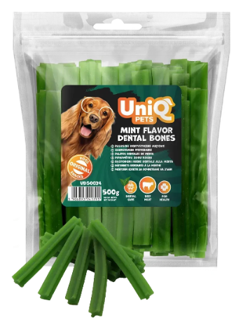 Збережіть зуби вашого цуценя блискучими, а дихання свіжим із м'ятними зубними паличками UNIQ PETS DOG SNACKS DENTAL. Ці текстуровані жувальні палички з натуральним м’ятним смаком поєднують користь та задоволення: борозенки на поверхні працюють як зубна щітка, видаляючи зубний наліт і допомагаючи зменшити утворення зубного каменю, а ваш собака насолоджується ситним хрускотом. Легкозасвоювані та без шкідливих інгредієнтів, ці палички підходять для щоденного догляду за порожниною рота.