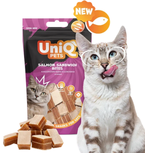 Подаруйте своїй кішці сендвічі UNIQ PETS CAT SNACKS SALMON & CHICKEN SANDWICH – ніжні, м’які ласощі з трьома видами білка: лосось, курка та тріска. Ці сендвічі не тільки смачні, але й корисні, забезпечуючи високий вміст білка для підтримки м’язової маси та омега-кислоти для блиску шерсті та здоров’я шкіри.