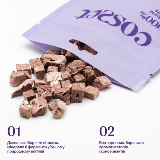 Натуральні ласощі Cosset із яловичих легень — це високоякісний білковий продукт для собак, який поєднує природний смак і максимальну користь. Завдяки технології freeze-dry (ліофілізації) м’ясо висушується без використання високих температур, що дозволяє зберегти всі поживні речовини, аромат і текстуру. Це моноінгредієнтний продукт, який не містить консервантів, барвників чи підсилювачів смаку. Легкі та хрусткі шматочки ідеально підходять як тренувальні ласощі або щоденна нагорода. Продукт майже не має запаху, не мастить руки й повністю відповідає природним харчовим потребам собаки.