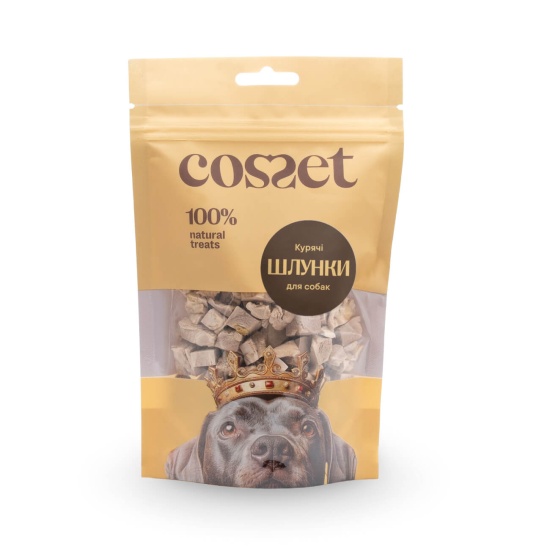 Натуральні ласощі Cosset із курячих шлунків — це поживний білковий продукт, створений із турботою про здоров’я собак. Завдяки технології freeze-dry (ліофілізації) шлунки висушуються без використання високих температур, що дозволяє зберегти їхню природну структуру, аромат і цінні поживні речовини. Це монопротеїновий продукт, який не містить консервантів, барвників і штучних ароматизаторів, тому підходить навіть для тварин із чутливим травленням. Ласощі легкі, зручні у використанні, не мастять руки й не мають вираженого запаху. Ідеально підходять як корисна нагорода під час тренувань або як щоденне доповнення до раціону.