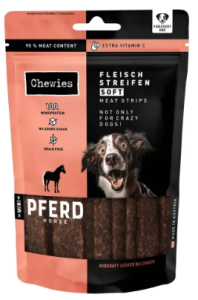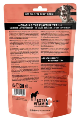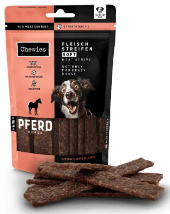 Це поживний та ніжний перекус для собак усіх вікових груп: від малих хвостиків до досвідчених легенд. Ласощі містять 95 % ніжно висушеного м’яса конини, яке має насичений смак і високу біологічну цінність. Завдяки м’якій консистенції смужки легко жуються та підходять навіть собакам із чутливими зубами або зниженим апетитом. Їх зручно ламати на менші шматочки — ідеально для тренувань або щоденної винагороди без перебору. Конина — це рідкісний, гіпоалергенний та добре засвоюваний білок, який часто рекомендують собакам з харчовими алергіями або чутливим травленням. Формула переважно монопротеїнова, без зерна, цукру, барвників і консервантів — максимум користі, нуль зайвого. Chewies® традиційно робить ставку на якість: ласощі збагачені вітаміном C для підтримки імунної системи, виготовляються без ГМО та без тестування на тваринах. Герметична упаковка з багаторазовим закриванням зберігає свіжість і аромат кожного шматочка.