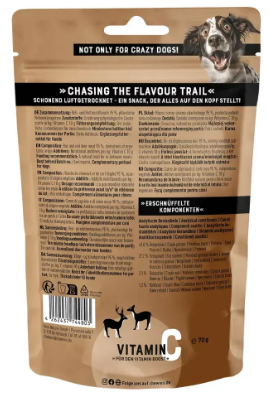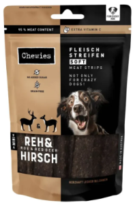 Це вишуканий м’ясний перекус для собак усіх вікових груп, який звучить як делікатес і смакується так само. Ласощі містять 95 % ніжно висушеного м’яса козулі та оленини, що надає смужкам насичений, природний смак і високу поживну цінність. М’яка консистенція робить їх ідеальними для цуценят, дорослих собак і навіть сеньйорів. Смужки легко ділити на менші шматочки — топ для тренувань або щоденної винагороди без перевантаження. М’ясо дичини — це рідкісний, легкозасвоюваний та добре переносимий білок, який часто обирають для собак із чутливим травленням або харчовими алергіями. Формула переважно монопротеїнова, без зерна, цукру, барвників і консервантів — тільки чистий смак і користь. Chewies® не грається в компроміси: ласощі збагачені вітаміном C для підтримки імунної системи, виготовлені без ГМО та без тестування на тваринах. Зручна упаковка з багаторазовим закриванням зберігає свіжість і аромат до останньої смужки.