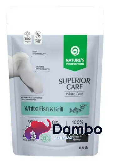 Повноцінний беззерновий вологий корм Nature's Protection Superior Care з білою рибою та крилем створений для дорослих собак усіх порід із білим або світлим забарвленням шерсті. Це турбота про щоденний раціон з урахуванням особливих потреб улюбленця: формула з високим вмістом якісного тваринного білка, доповнена спеціальними активними компонентами, Microzeogen та необхідними поживними речовинами для комплексної підтримки шкіри, шерсті, травлення та загального здоров’я.