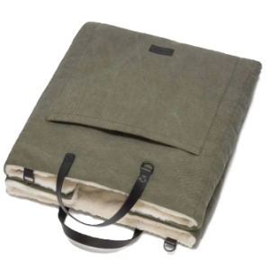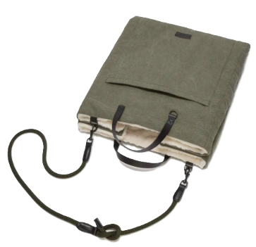 Переносний тревел-мат, що складається у сумку через плече. Міцний канвас, м’яка плюшева підкладка, регульований ремінь, який можна використовувати як аварійний повідець. Велика кишеня, деталі з веганської кактусової шкіри.