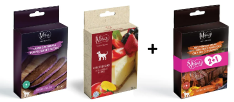 Купуй два — отримай третій у подарунок! У наборі: бастурма з ягнятини з фіолетовим бататом, сублімований чізкейк з яблуком і журавлиною, BBQ стейк з оленини з томатами та гарбузом у подарунок. Без зернових, 100% натурально.