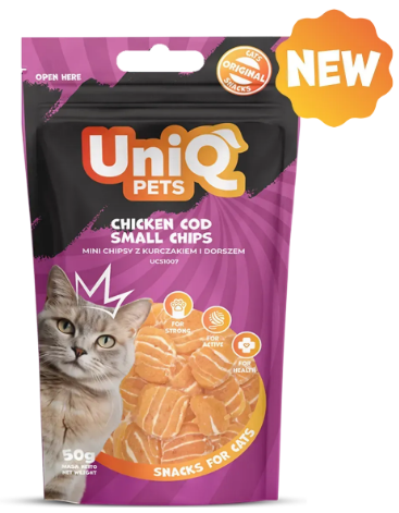 UNIQ PETS CHICKEN & COD CRISPS — це не просто ласощі, а збалансоване джерело білка з легким хрустом, що приносить задоволення і користь кожному пухнастику.