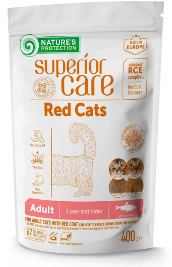 Nature's Protection Superior Care з оселедцем для дорослих котів усіх порід із рудим і коричневим забарвленням шерсті – це повнораціонний збалансований сухий корм супер преміум класу з високоякісним джерелом білка. Ретельно підібрані та збалансовані інгредієнти корму роблять структуру сліз і слини прозорою та допомагають захистити шерсть котів від появи коричневих плям. Це повнораціонний сухий корм зі спеціальною формулою Red Coat Enhancer (RCE), яка захищає та посилює червоний пігмент у шерсті, забезпечуючи висококорисними амінокислотами, що сприяють підтримці здорової, яскравої шерсті та покращують загальні функції організму. Повнораціонний склад сухого корму містить усі необхідні поживні речовини та забезпечує належну засвоюваність і смакові якості. Основним джерелом білка в цьому повноцінному сухому кормі для котів є оселедець. Гіпоалергенний, легко засвоюється, ідеально підходить для контролю ваги та є чудовим джерелом вітамінів D, B₁₂ та мінералів. У складі також міститься органічний екстракт календули та зеленого чаю для покращення зору та антиоксидантної підтримки. Склад збагачений відмінними джерелами жирних кислот Омега-3, які допомагають підтримувати інтенсивний колір шерсті та ідеальний стан шкіри.