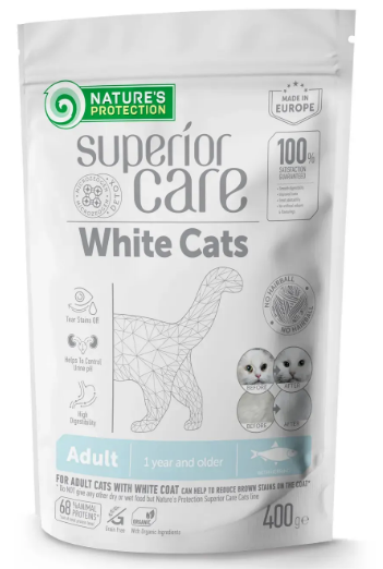 Nature's Protection Superior Care з оселедцем для дорослих котів усіх порід із білим забарвленням шерсті – це повнораціонний збалансований сухий корм супер преміум класу з високоякісним джерелом білка. Ретельно підібрані та збалансовані інгредієнти корму роблять структуру сліз і слини прозорою та допомагають захистити шерсть котів від появи коричневих плям. DL-Метіонін допомагає ефективно знизити ризик утворення каменів і кристалів у сечовивідних шляхах. Цей корм збагачений інгредієнтами, які забезпечують ідеальну ефективність для гарного самопочуття улюбленця. Повноцінний склад сухого корму забезпечує всіма необхідними поживними речовинами та гарантує належну засвоюваність і смакові якості. Основним джерелом білка в цьому повноцінному сухому кормі для котів є оселедець. Гіпоалергенний, легко засвоюється, ідеально підходить для контролю ваги та є чудовим джерелом вітамінів D, B₁₂ та мінералів. У складі також міститься органічний екстракт календули та зеленого чаю для покращення зору та антиоксидантної підтримки. Склад збагачений відмінними джерелами жирних кислот Омега-3, які допомагають підтримувати інтенсивний колір шерсті та ідеальний стан шкіри.