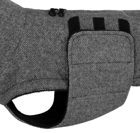 Тепле пальто з флісовою підкладкою та водовідштовхувальною вовняною тканиною. Спеціальний крій для такс із подовженою спинкою та зручними липучками. Не сковує рухів, добре гріє живіт і спину, має отвір для шлейки й легко переться.