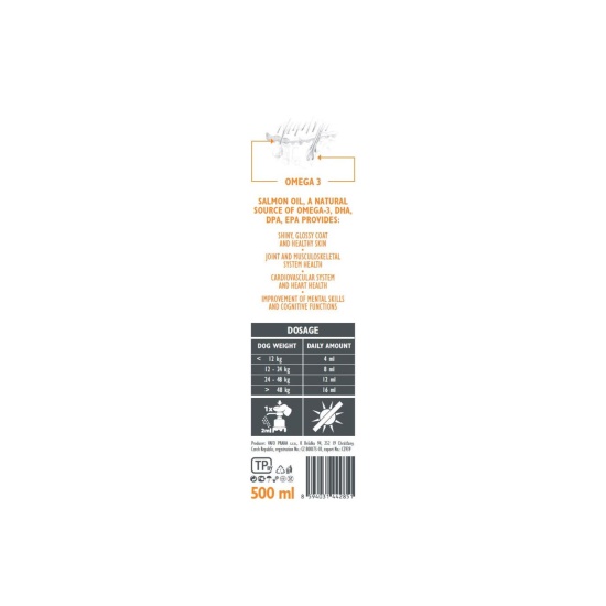 Це функціональна вітамінна добавка для собак будь-якого віку та породи, яка працює не точково, а по всьому організму. Основа продукту — натуральна олія лосося, багата на поліненасичені жирні кислоти Омега-3 (EPA та DHA) і Омега-6 у правильному, біологічно оптимальному співвідношенні. Омега-3 жирні кислоти відіграють ключову роль у підтримці здоров’я шкіри, шерсті, суглобів, серцево-судинної та нервової систем. EPA має природну протизапальну дію та допомагає зменшувати шкірні подразнення. DHA бере участь у формуванні сітківки ока, структур головного мозку та підтримує когнітивні функції.