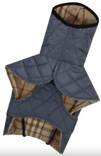 Двосторонній теплий жилет із синтепоном, водовідштовхувальною плащівкою та фланеллю. Має регульований пояс, капюшон-комір і отвір для повідця. Універсальна модель для щоденних прогулянок.