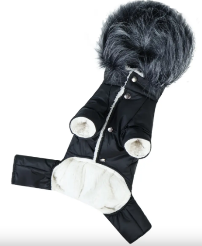 Зимовий комбінезон DogsBomba з водовідштовхувальної плащівки, утеплений синтепоном і підбитий м’яким плюшевим хутром, надійно захищає від холоду та вологи. Має комір-стійку, капюшон із фіксатором, отвір для повідця та зручну застібку на кнопках. Унісекс-модель для теплих і комфортних прогулянок узимку.