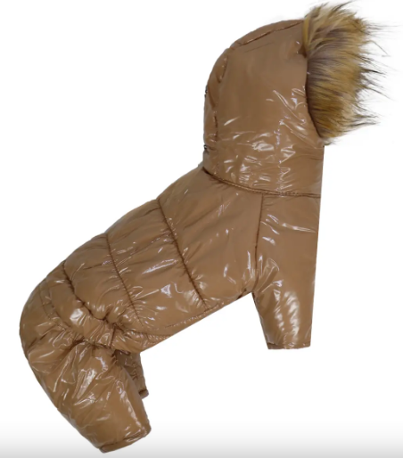 Стильний лакований зимовий комбінезон із водовідштовхувальної плащівки з утеплювачем синтепон і нейлоновою підкладкою. Має капюшон з опушкою, еластичні манжети, проріз для повідця та застібку на кнопках. Унісекс модель для теплих і модних прогулянок узимку