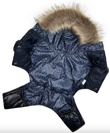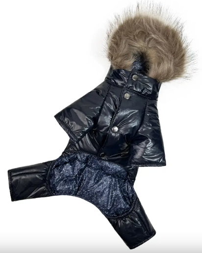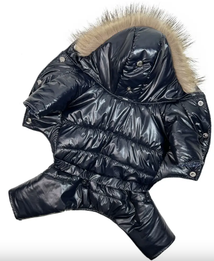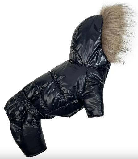 Стильний лакований зимовий комбінезон із водовідштовхувальної плащівки з утеплювачем синтепон і нейлоновою підкладкою. Має капюшон з опушкою, еластичні манжети, проріз для повідця та застібку на кнопках. Унісекс модель для теплих і модних прогулянок узимку